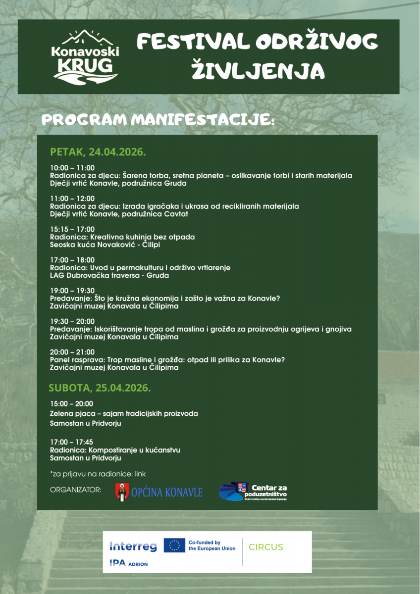 Općina Konavle, u suradnji s Centrom za poduzetništvo Dubrovačko-neretvanske županije, organizira manifestaciju „KONAVOSKI KRUG – Festival održivog življenja“ (pilot-akcija), koja će se održati u petak i subotu, 24. i 25. travnja, na više lokacija u Konavlima. Program obuhvaća niz raznovrsnih aktivnosti koje povezuju tradiciju s modernim konceptima kružne ekonomije, s ciljem edukacije građana i osnaživanja lokalnih proizvođača. Svrha manifestacije je pokazati kako kružna ekonomija nije samo teorijski koncept, već konkretan i primjenjiv način života koji doprinosi očuvanju resursa i stvaranju održive budućnosti za Konavle.